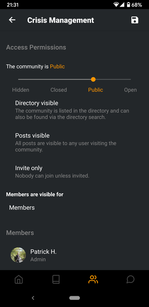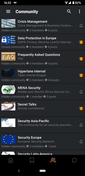 Communities can be open, closed, public or hidden, depending on your needs. Whether you want to have a truly private discussion in a small circle, engage as many people from one field as possible, or just catch up on the latest news or job adverts in security, all is possible. Invite-only communities are the norm, in which users can apply for membership but must be endorsed by an existing member or admin, to ensure a high quality of participant and contributions.