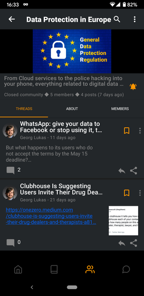Communities are sorted by new or frequently discussed threads, all created by other community members, and can facilitate discussions and sharing of comments by other users. Posts and content can be securely erased at any time. You can set your own rules and regulations for your community and manage all members in line with these principles.