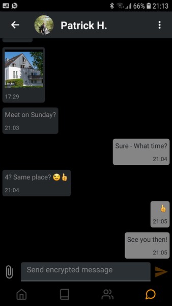 Chats allow for a direct one-to-one communication. Contacts for chats can either be people you already have in your address book, your public Hyperlane contacts, or connections with whom you share a community. Unless you specially allow this, no one else can send you messages. Your address book and contact information is not stored on the Hyperlane servers and are only used during the session. Neither we, Google, nor Apple or any other third party can access your message content or contacts. This includes Chat notifications, which are only decrypted when accessing the app and not shared with your Google or Apple for the message preview.